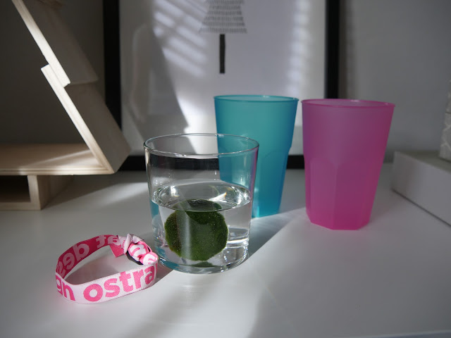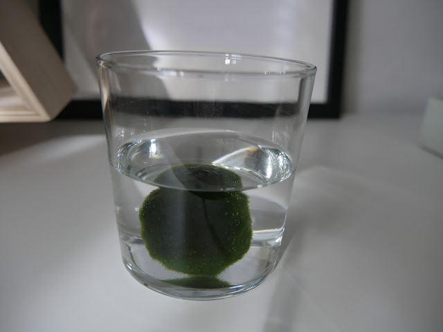 ... už dlouho jsem nad řasokoulí přemýšlela, tak uvidíme, jestli to spolu zvládneme - stále mi letité i neletité rostliny z ničeho nic přestanou růst a uvadnou. Řasokoule u sebe měla lísteček, že je celkem nenáročná, že si ve sklenici vychladlé převařené vody žije svým vlastním životem ...