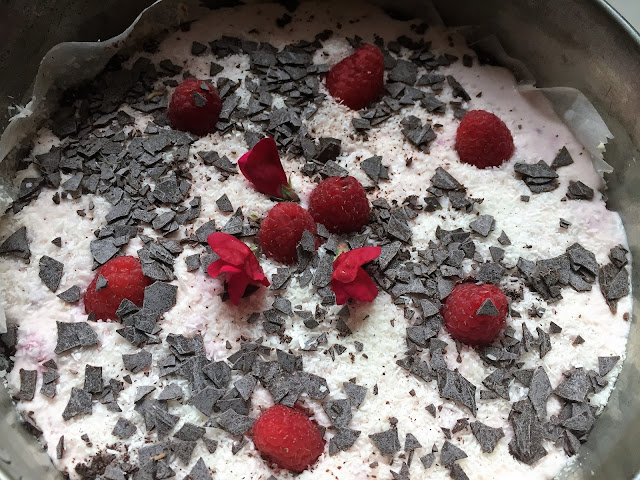 je varianta Super rychlé ostružinové mňamky, místo dvou tvarohů jsem použila pouze jeden plnotučný tvaroh a jeden kelímek 16 procentní zakysané smetany a právě dozrálé velké maliny z vlastní zahrady. Na ozdobu pak kromě kokosu také posyp z mléčné čokolády.