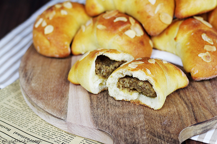 Letos jsem se pochlapila a svatomartinské šátečky konečně upekla včas. Možná taky proto, že svatý Martin vychází na sobotu a na víkend se peče prostě vždycky. Recept na ty nejlepší rohlíčky od babičky jsem samozřejmě nemohla najít (nevadí, přijdou na řadu jindy), tak jsem sáhnula po receptech, co si schovávám ve speciálním šanonu, za ty roky už je přímo obřích rozměrů… Rohlíčky jsou z Albert magazínu, bylo mi moc sympatické, že se do těsta přidává tvaroh, obvykle je zárukou kyprosti a vláčnosti a ani tady to nebylo jinak. Ořechovou náplň jsem dala svoji, je mnohem jednodušší než ta z originálního receptu a dává vyniknout právě ořechům. Možná by té náplně stačilo o třetinu méně, šátečky jsou pěkní bucláčci, tvar podkovy se tak během pečení poněkud ztratil, ale když my tu náplň moc rádi! Podkova má být připomínkou svatého Martina a jeho koníka, snad mi to odpustí. Jestli tedy zítra dorazí…