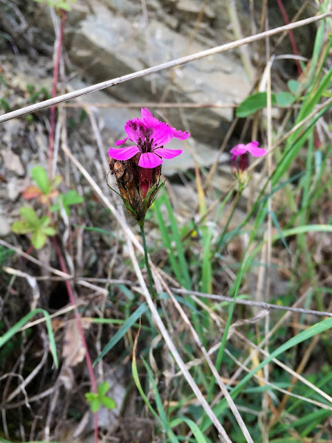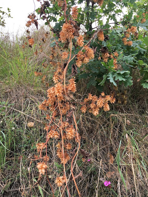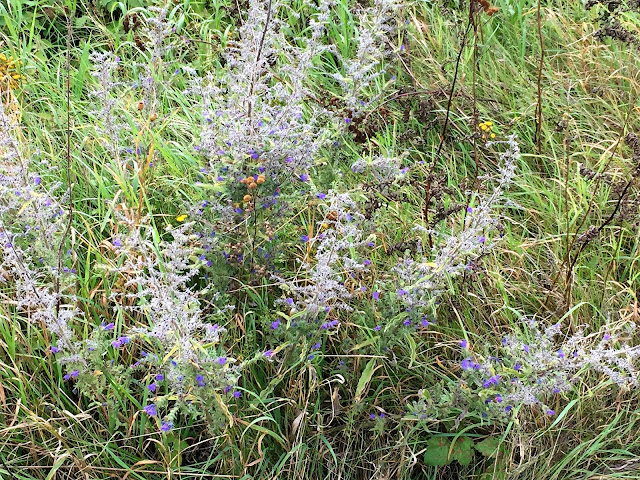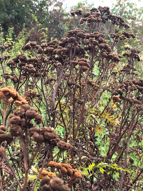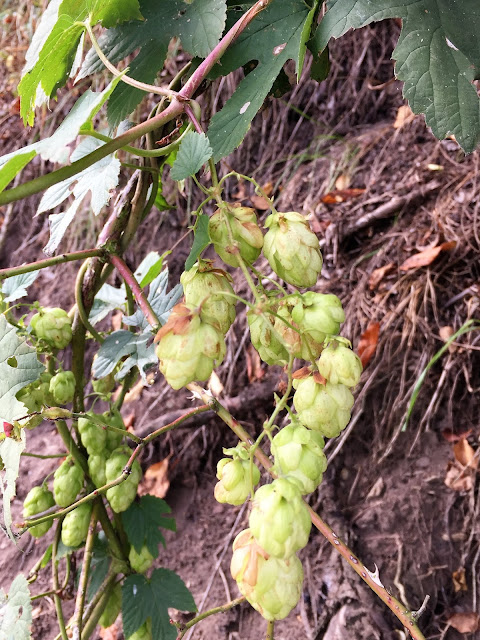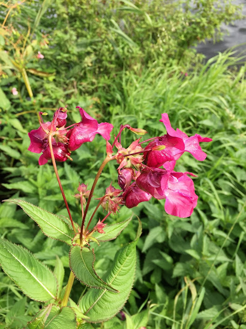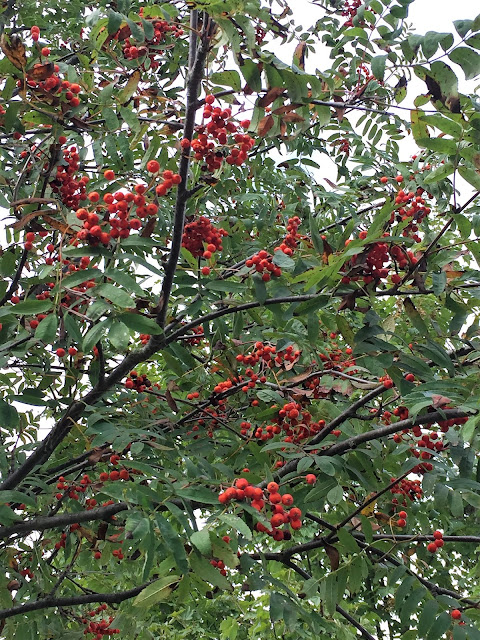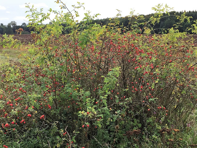 Šípky, jeřabiny, bobule všeho druhu, jejichž jména jsou pro mne záhadou, udatna lesní, dále vysoká rostlina kvetoucí růžovými květy připomínající zvonky či kalichy nádherou květů připomínající orchidej…jakýsi druh kohoutku a planý chmel a při závanu studeného protivětru pád lístků z břízy na cestu a do řeky… javor, pomalu se začínající od vršku vybarvovat do červena a žluta…prostě podzim…je zde…