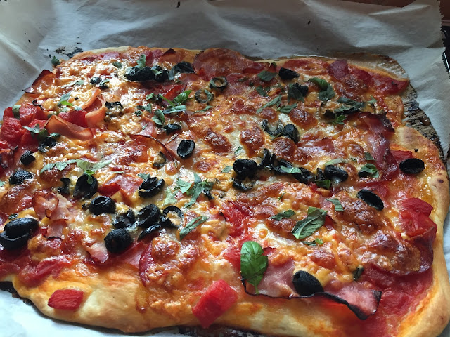 Po návratu domů, jsem myslela že lehnu, ale opak byl pravdou. Ten o němž nesmím psát, vznesl jasný požadavek, koláč dobrý, ale proč že mám v lednici těsto na pizzu, když jí jakože „nechci udělat…?? „Recept na těsto naleznete v receptech Emanuela Ridiho, kdy prostě zázračné mouky 00 používám dostupnou mouku hladkou…