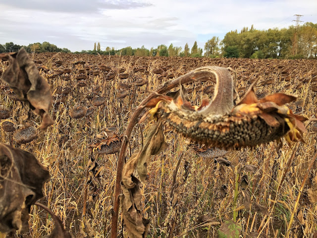 Recept je zcela prostý, takřka hrnkový, prostě od oka… necelý hrníček hladké mouky, trochu kypřícího prášku, trochu skořice, trochu třtinového cukru, necelou vaničku plnotučného tvarohu, jedno vejce, 2 lžíce oleje, špetka soli, několik hrstí vypeckovaných a pokrájených švestek, drobenka…trochu hladké mouky, trochu třtinového cukru, plátek másla a špetka skořice, péci na 180 st. asi půl hodiny… a protože se tomuto koláči nedá odolat, vypravila jsem se na kole k Labi a pořádně si dala do těla…celkem 42 km v poměrně krátkém čase, abych ten švestkový hřích ze sebe „vypotila“. Po cestě zpět jsem však musela několikrát zastavit, protože se opravdu nedalo jen tak projet rychlostí blesku bez povšimnutí kolem té krásy. Tak třeba slunečnice, nesmírně fotogenické s hnědou barvou v mnoha odstínech…neodolatelné…