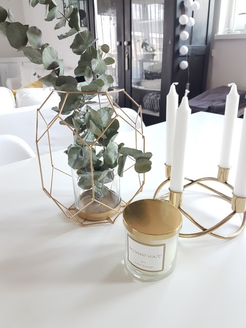 Keď môžem používať jednu vec na dva spôsoby je dekorácia o to zaujímavejšia. Tak to je aj s týmto svietnikom geometrického tvaru. Pôvodne bol vo farbe cooper, ale tú momentálne v interiéri nepoužívam. Zlatú môžete u nás vidieť oveľa častejšie a preto som si na pomoc zobrala zlatú farbu v spray. Vysoký sklenený cylinder na sviečku som vymenila za sklenený pohárik, ušetrený z vyhorenej sviečky od firmy PartyLite, a váza je hotová.
