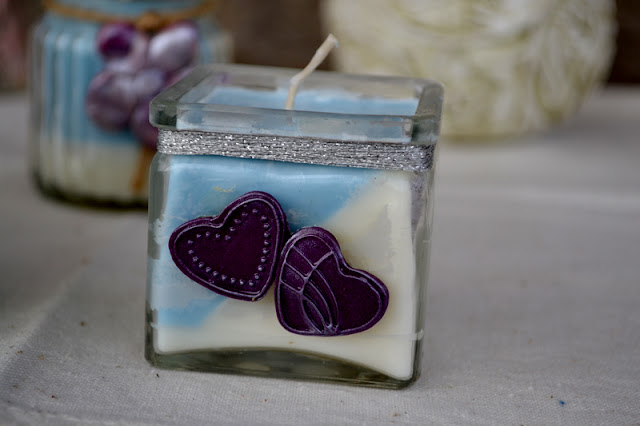 Na ozdôbky som využila Fimo hmotu. Aby sa mi podarilo vytvarovať pekné srdiečka pomohla som si silikónovou formičkou, ktorú som niekedy dávno omylom objednala na odlievanie mydla. Nevšimla som si, že je taká miniatúrna. Dlho ležala nevyužitá a teraz konečne našla svoje uplatnenie :-). Po vytvarovaní som srdiečka opatrne pritlačila na svietnik a "piekla" v rúre na 110 stupňov 30 minút. Pre zaujímavý kovový efekt som na ich povrch, ešte pred "pečením" , naniesla strieborný púder . Po vychladnutí som výrobok natrela špeciálnym lakom na Fimo hmotu.