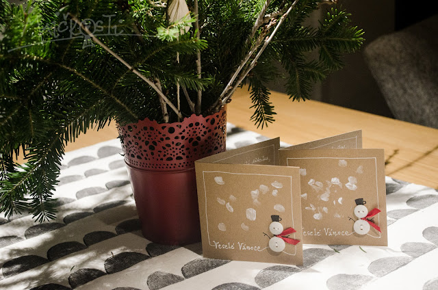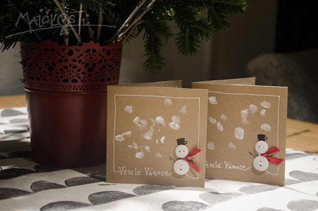 Takže se ospravedlňuji. Letos teda jen tři druhy cukroví, co jsme stihly po odpoledních spáchat s Madlou. Naštěstí je to dobrá a nadšená pomocnice 🙂 No a pak tahle přáníčka. Dlouho jsem vymýšlela motiv, abych ji mohla zapojit. Nakonec mám tyhle knoflíkové sněhuláky a Madla prstem razítkovala „sněží“. Ovšem mělo to jistá úskalí. Mohlo mě napadnout, že dceru to bude bavit jen chvíli. Po třech přáníčkách šla od toho. Takže druhý den další várka. K třetí už jsem ji měla problém ukecat, nelíbil se jí prst špinavý od balakrylu 😀 Tak jsme to dodělaly bramborovým razítkem – to jsou ty dva poslední kousky na fotkách (jejichž kvalita je děsná – já vím. Výcvak narychlo ve dvě v noci. Pardón). Už jsme je nestihly ani poslat, a tak jsme je musely předat osobně. Celkově to letos bylo na poslední chvíli. Díky těmto všem komplikacím se nakonec stalo, že sněhuláky dostala jen rodina, víc jsme jich nezvládly. Zbytek blízkých se musel spokojit s jinými přáníčky. Alespoň, že byly taky handmade a moje :-)… Těm, kterým dojdou až po Štěpánovi, se předem omlouvám. Přátelé, odpusťte. Prostě… víte, jak je to s časem, když se staví barák 😉