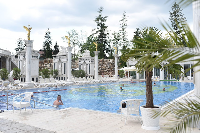 Den odjezdu jsme si udělali zastávku v Rajeckých Teplicích, kam jsem se chtěla už podívat hodně dlouho. Mají tu totiž termální lázně Aphrodite. Připadáte si jak v řeckých lázních, všude bílý kámen, sloupy a mramor. Hrozně fotogenické místo. Měli jsme to tu skoro pro sebe, byli jsme tu ve všední den a tak tu nebylo ani moc lidí.