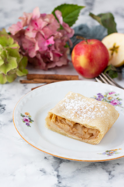 Těsto rozdělíme na dvě poloviny (cca 260 g), druhou půlku zatím vrátíme zpátky pod fólii. Na pracovní desku si rozložíme utěrku (ubrus) a důkladně ji poprášíme moukou (tou opravdu nešetříme, jinak se těsto přilepí na utěrku a během zavinování štrúdlu se potrhá). Těsto prsty roztáhneme na obdélník a válečkem ho vyválíme na několik milimetrů tenký plát. Poté ho lehce potřeme máslem a začneme opatrně vytahovat konečky prstů a hřbety rukou (díky máslu těsto nebude osychat a praskat, ani se slepovat k sobě, pokud se vám omylem povede nějak ho přehnout přes sebe - vyzkoušeno, není zač). Těsto vytahujeme postupně po celém obvodu a snažíme se tahat od středu, aby uprostřed nezůstalo silné a na krajích se naopak netrhalo (malé dírky nevadí, jak se celý štrúdl zavine, schovají je další vrsty těsta, větší díry zalepte kouskem těsta). Na šířku by mělo být o něco větší než plech, na délku záleží, jak moc se nám povede natáhnout (mě to vycházelo na celou utěrku). Každopádně by těsto mělo být tak tenké, že by se přes něj daly číst noviny. Nakonec ho opatrně potřeme/pocákáme rozpuštěným máslem, aby se vrsty těsta během pečení neslepily.
