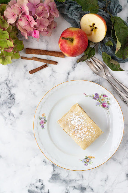Mezitím si nachystáme náplň. Jablka oloupeme, vykrájíme středy a nakrájíme na malé plátky/kostičky, případně nastrouháme nahrubo. Promícháme je s citronovou šťávou (já šťávu ještě doliju asi 2 lžícemi vody, abych měla jistotu, že obalí všechna jablka).