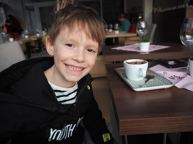 … Bertíkovi jeho babyccino chutnalo. Je to našlehané mléko posypané kakaem. Doma se mléka ani nedotkne, ale v kavárně to má jako kafíčko, tak to si užívá :-)) …