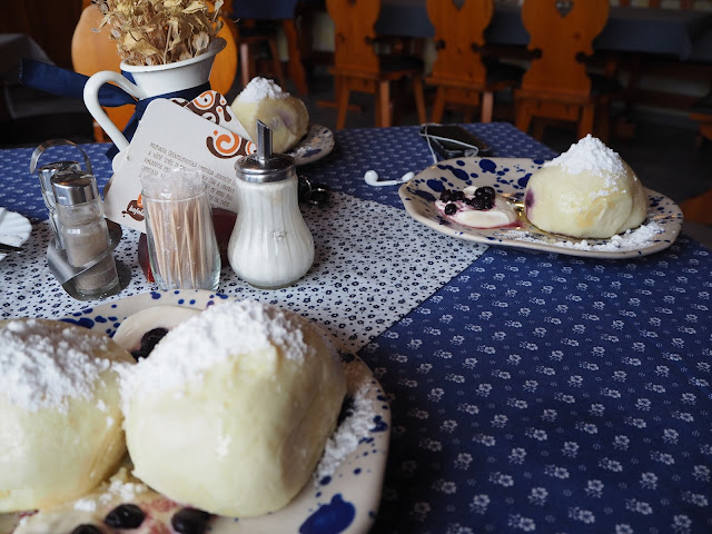 … cestou tam se stavujeme na menu. Pořádně nikdy nevíme kam. Hledáme něco u cesty ať nemáme žádnou zajížďku. Věděli jsme o dvou restauracích ve Vsetíně, ale obě měli zavřeno. Takže jsme se nakonec stavili v Hotelu Sirákov. Tam sice menu nemají, ale hlad už byl velký. Manžel i Bertík milují kynuté knedlíky s borůvkami, i minulý týden na svahu je měli a já jsem si je dala taky …
