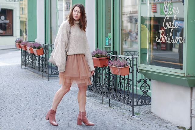 A jak si ho užívám ve skříni? Tak nějak napůl s létem. Ještě se nechci rozloučit s letními kousky. Třeba jako v případě téhle sukně. Stačilo ji doplnit svetrem a kozačkami a bylo mi příjemně. Není na tom nic těžkého. Minule jsem pobíhala ve městě v midi letních šatech, přes které jsem oblékla pastelový rolák. Nějak mě ty šedivé a černé barvy zatím nelákají a nejlíp se cítím právě v tomhle. Asi to odráží i mou momentální spokojenost, která se takhle projevuje. Ono na tom asi něco bude. Vypadávající vlasy neřeším, už se to asi konečně ustálilo a můj ekzém na pleti konečně mizí. Kdybyste chtěli tip na zkušenou kožní, piště 🙂 Neřeším kila navíc, prostě pravidelně sportuji a jím zdravě i si dopřávám. Rovnováha podle mě. Pracovně super a konečně i spím normálních 8 hodin denně. Nemám si na co stěžovat. Mám teď prostě růžové období a naprosto mě to tak baví.