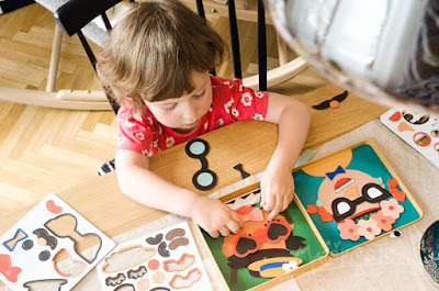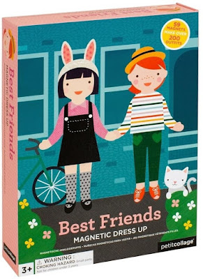 Je od značky Petit Collage a jmenuje se Funny faces. Jde o sadu magnetických částí obličeje v praktické kovové krabičce, která se po otevření promění ve dva prázdné obličeje a je jen na vás, jaké osobnosti dáte vzniknout. Bude to holka, nebo kluk? Veselá babička s drdůlkem, nebo smutný námořník? Možností je spousta. K dispozici máte různé oči, nosy, ústa, fousy, vlasy, pokrývky hlavy, ozdoby krku... a pak víceméně abstraktní tvary, ze kterých může být nos, oko, piha nebo náušnice. Prostě a jednoduše - fantazii se meze nekladou. Petit Collage navíc vyniká jednoduchým, lehce retro, designem a příjemnými barvami, které baví i mě :-)