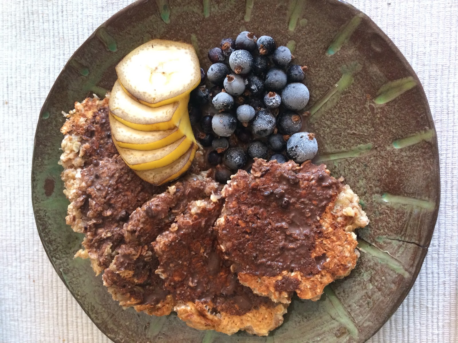 | Ovesné placky s ovocem přelité domácím čokoládovým krémem z burákového másla. |