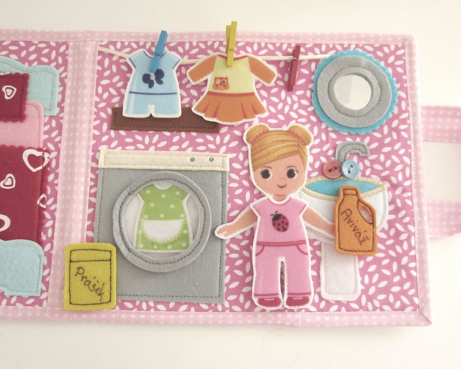 ...spousta látkových knížek tohoto typu na mě bývá často až moc překombinovaná a příliš barevná. Ale do téhle jsem se zamilovala na první pohled a jestli se u dcerky neuchytí, budu si s ní tajně hrát sama ;-). Já totiž vždycky milovala domečky s nábytkem pro panenky a různé pelíšky a postýlky a také ty vystřihovánky s oblečky a tady je to tak hezky a vkusně nakombinované a zhuštěné do jednoho, že prostě nešlo odolat...