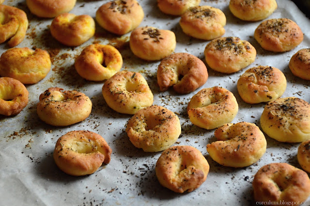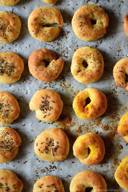 From the prepaired dough make little balls or shape it to prezles or loops and circles. Put them on a pre-prepared sheet with a baking paper.