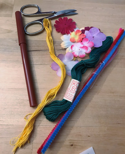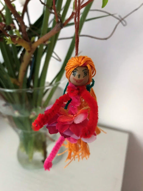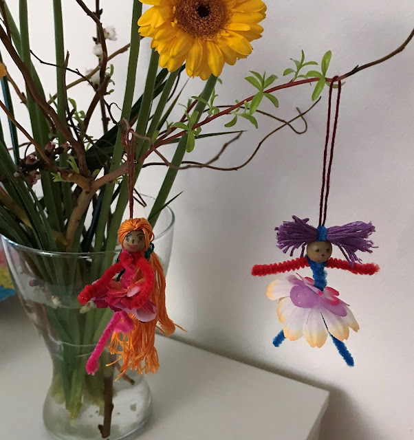 Vytvořily jsme spolu celkem šest panenek, víl či romantických tanečnic, kterým jsem ještě tavnou pistolí přilepily pod vlásky jemné poutko, takže krásně nám přivolávají jaro v dnešním dost chladném a hlavně větrném sobotním odpoledni společně s JPK (JPK - jaro přivolávací kytice - což je cokoliv, co květe společně s pruty, větvemi a kočičkami...). V návodu bylo sice uvedeno, že je možno vytvořit až 12 květinových panenek, ale dřevěných hlaviček, bylo jenom 6... Odpustila jsem českému tlumočníkovi, ale to nebylo podstatné... napadlo mne, že by se daly květinové panenky vytvořit i doma, skoro z domácích produktů. Potřebovali bychom plyšové drátky, vyšívací bavlnku a  pár kousků jemné látky... dřevěný korálek na hlavičku, fixy, tavnou pistoli, kterou se vlásky, poutko a sukýnky přilepí k plyšovému drátku, se kterým se pěkně pracuje i malým dětem. Ta tavná pistole však není podmínkou protože, když se drátek šikovně zkroutí, tak tvoří pevný základ.