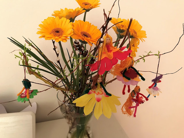 Vytvořily jsme spolu celkem šest panenek, víl či romantických tanečnic, kterým jsem ještě tavnou pistolí přilepily pod vlásky jemné poutko, takže krásně nám přivolávají jaro v dnešním dost chladném a hlavně větrném sobotním odpoledni společně s JPK (JPK - jaro přivolávací kytice - což je cokoliv, co květe společně s pruty, větvemi a kočičkami...). V návodu bylo sice uvedeno, že je možno vytvořit až 12 květinových panenek, ale dřevěných hlaviček, bylo jenom 6... Odpustila jsem českému tlumočníkovi, ale to nebylo podstatné... napadlo mne, že by se daly květinové panenky vytvořit i doma, skoro z domácích produktů. Potřebovali bychom plyšové drátky, vyšívací bavlnku a pár kousků jemné látky... dřevěný korálek na hlavičku, fixy, tavnou pistoli, kterou se vlásky, poutko a sukýnky přilepí k plyšovému drátku, se kterým se pěkně pracuje i malým dětem. Ta tavná pistole však není podmínkou protože, když se drátek šikovně zkroutí, tak tvoří pevný základ.
