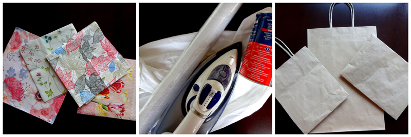 K výrobe potrebujeme žehličku, nejakú podložku na žehlenie,papier na pečenie, servítky, potravinovú fóliu, papier, látku, papierovú krabičku alebo tašku ...