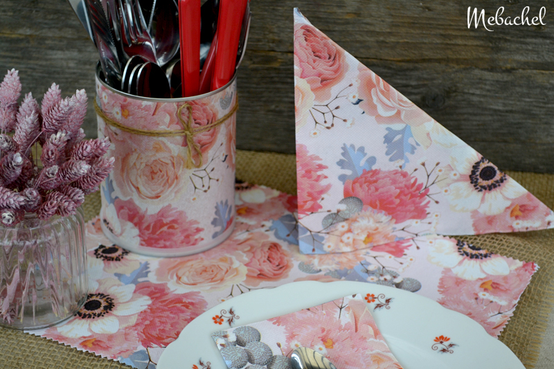 Ak chcete zažiariť na letnej párty, ktorú budete organizovať na vašej záhrade, môžete si takýmto spôsobom vyrobiť napríklad prestieranie. Servítka sa dá preniesť aj na látku, ja som použila ako podklad vyradenú bielu plachtu. Ešte som k tomu vyrobila zo starej plechovky dózu na príbory a spolu so servítkou v rovnakom dekore to na stole vyzerá úžasne. Takéto prestieranie veľmi dobre ladí s jutovým alebo ľanovým obrusom . Už sa teším na leto, keď to celé doladím kytičkou lúčnych kvetov alebo takýmito sviečkami.