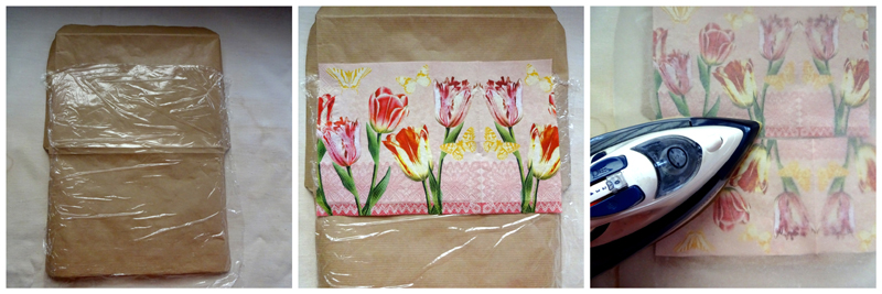 Postup je naozaj jednoduchý. Zo servítky si oddelíme najvrchnejšiu vrstvu (podobne ako pri dekupáži), z fólie odstrihneme potrebný rozmer . Na podložku položíme papier, na ktorý rozprestrieme fóliu. Na fóliu položíme servítku a poslednou vrstvou bude papier na pečenie. Žehličku nastavíme na maximálny výkon (bez naparovania) a jemným tlakom zažehľujeme. Teplom sa fólia rozpustí a servítka sa prenesie na podkladový papier, s ktorým úplne splynie. Výsledok je naozaj prekvapivý.