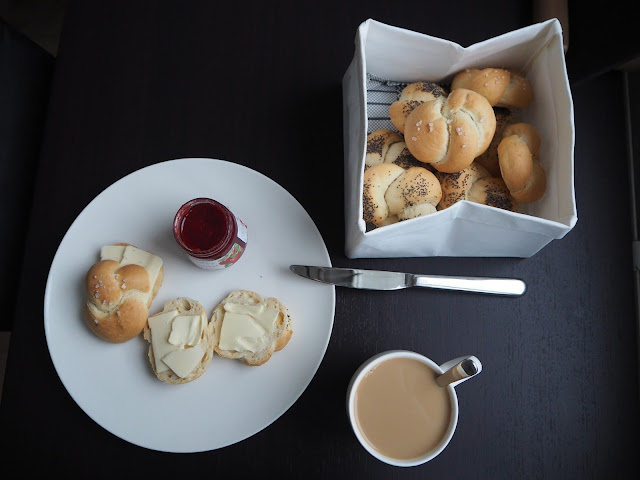 … ještě víc nervózní než v neděli jsem posnídala čerstvě upečené housky. Těšila jsem se na jahodovo-malinovou marmeládu na čerstvé housce, ale po otevření skleničky jsem zjistila, že to je asi pečený čaj – to je tak, když se pořádně nečte, co se kupuje. Do echt jahodové marmelády jsem se ani osvědčenými triky nedostala, takže jsme měla na snídani houstičky jenom s máslem … a kafíčko. Zdravé snídaňové kaše FAKT nedávám!! 😉 …