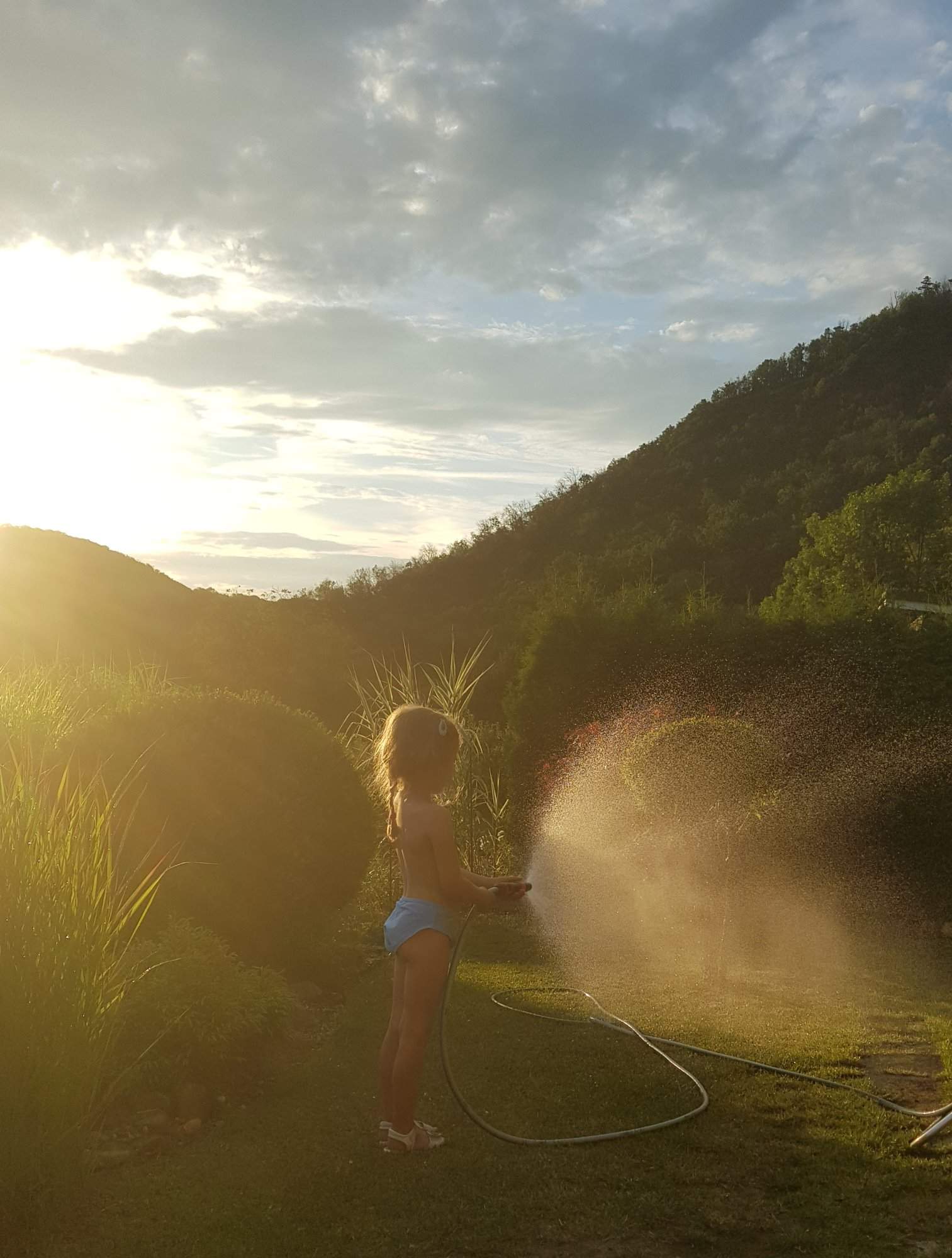 Se zahradní hadicí poskakuje, raduje se a každé rostlině dopřeje dostatek vláhy.