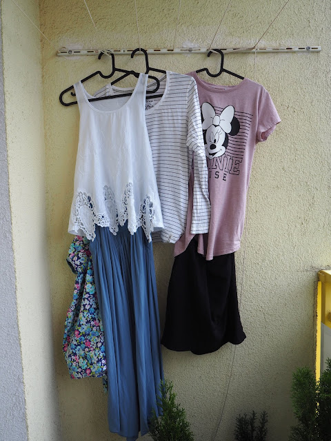 chtěla jsem tento příspěvek nazvat „už tam nemůžu“, ale raději jsem zvolila víc srozumitelný název. Úlovky jsou ze sekáče. Mám z nich velikánskou radost, ale asi bych tam opravdu měla přestat chodit ;-). Vzala jsem i to, co až tak nepotřebuju. Třeba černou krátkou sukni, bílé volné tílka – jedno s kapsičkou, druhé čb (cik cak vzor) …