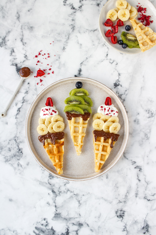Z vaflí vykrájíme kornoutky, na talíři přidáme ovoce a dozdobíme polevou ze zakysané smetany/jogurtu a čokoládové pomazánky/ořechového krému.