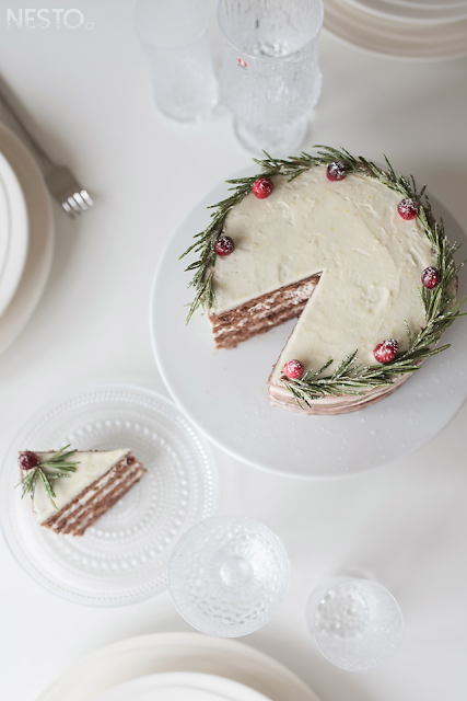A tak tu asi budeme mít takovou novou tradici v podobě rodinného vánočního dortu. Mám ráda spojení perníku a něčeho sladkokyselého a pikantního, a tak jsem tam zakomponovala citron a červený rybíz. Přidejte si k tomu vůni čerstvého rozmarýnu, no a nemá to chybu. Kdo nemusí citronové krémy, dá citronu méně, ale bez něj to zase nebude ono.