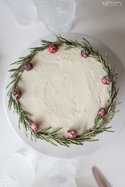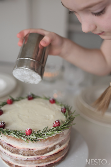 Na závěr dort potřeme krémem podle libosti (chtěla jsem, aby byl na stranách vidět korpus) a ozdobíme čerstvým rozmarýnem a bobulkami. Pro dokonalý efekt vršek dortu pocukrujeme moučkovým cukrem, aby působil jako zasněžený.