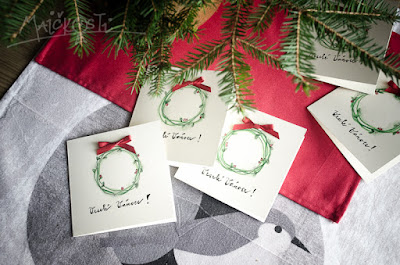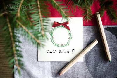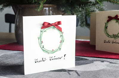 Přiznám se Vám, dlouho jsem váhala, jaký motiv zvolit. Samozřejmě jsem sjížděla Pinterest. Nejdříve se mi pořád nic nelíbilo. V jednu chvíli se mi toho naopak líbilo až moc. A tak jsem si buď mohla hodit korunou, a nebo se rozhodnout podle toho, co mám doma v šuplíku k dispozici. Ano, vzhledem k mé momentální situaci jsem se rozhodla pro druhou, tedy low-cost variantu. Krémová přáníčka mi zbyla ještě ze svatebního tvoření a teď se to perfektně hodilo, takže v podstatě jediný materiál, který mi chyběl, byl kousek červené stužky a tu jsem pořídila za pár peněz v galantérce. Jako motiv jsem nakonec zvolila prostý věneček. Něco mezi boho stylem a klasickým vánočním kýčem, vždyť to znáte! 🙂 Obrys jsem nakreslila inkoustovým fixem, který je skvělý v tom, že přes něj lze malovat vodovkama a nerozpíjí se, takže jsem ho mohla i vybarvit. Pro tyto účely jsem Madle ukradla několik jejích akvarelových pastelek (mimochodem jsem zjistila, že ty z Ikea jsou mnohem lepší než pastelky, které koupíte v papírnictví – mám osobní zkušenost ještě s Mapedem a ty mě trochu zklamaly…). Práce to byla poměrně rychlá – obtáhnout pastelkou, rozmazat mokrým štětcem, procvaknout dírkovačkou nahoře dva otvory a uvázat mašličku.