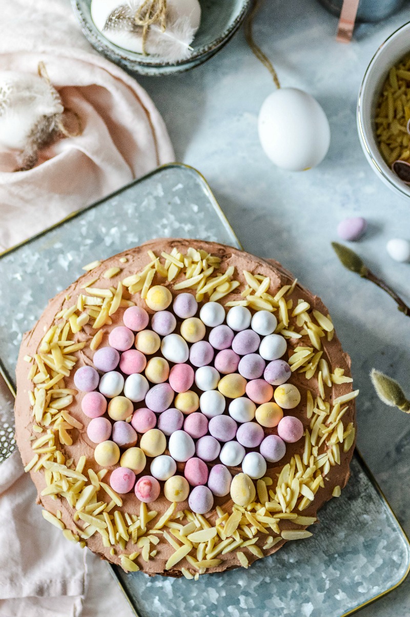 Na krém vyšleháme studené mascarpone se smetanou a s kakaem. Krém naneseme na brownies. Střed koláče ozdobíme čokoládovými vajíčky a okraje posypeme mandlovými špalíčky. Necháme ztuhnout v chladnu.