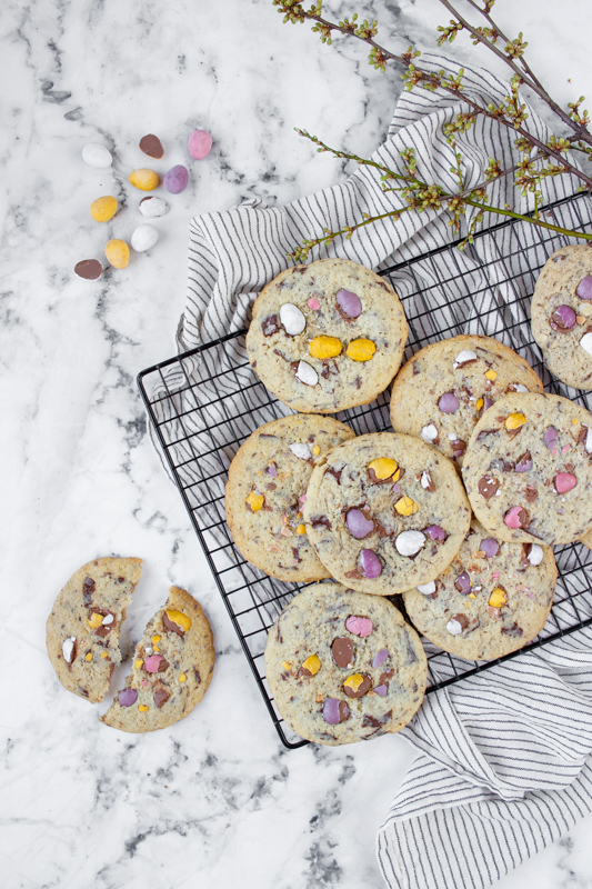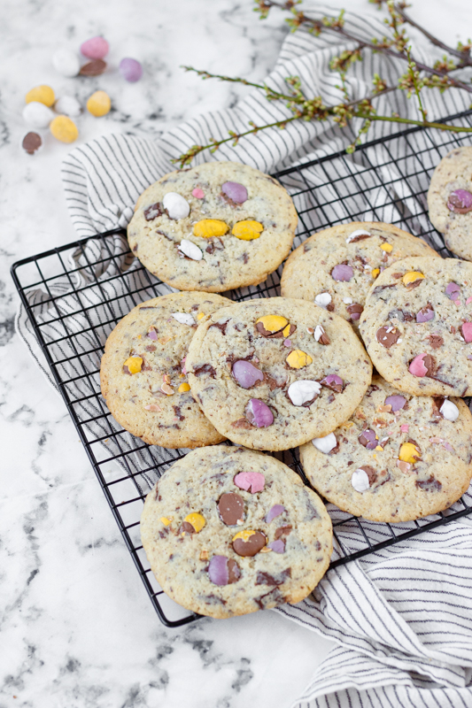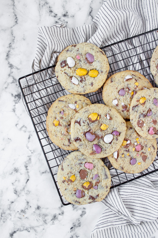 Troubu předehřejeme na 175 °C. Z těsta lžící odebíráme stejně velké kousky (cca 2 lžíce na 1 sušenku), z každého v rukách rychle vyválíme kuličku a dáme ji na plech vyložený pečícím papírem. Mezi jednotlivými kuličkami necháme velké rozestupy, během pečení se hodně roztečou (na plech se jich vejde pět, max. šest). Každou kuličku lehce rozmáčkneme a navrch dáme pokrájená čokoládová vajíčka.