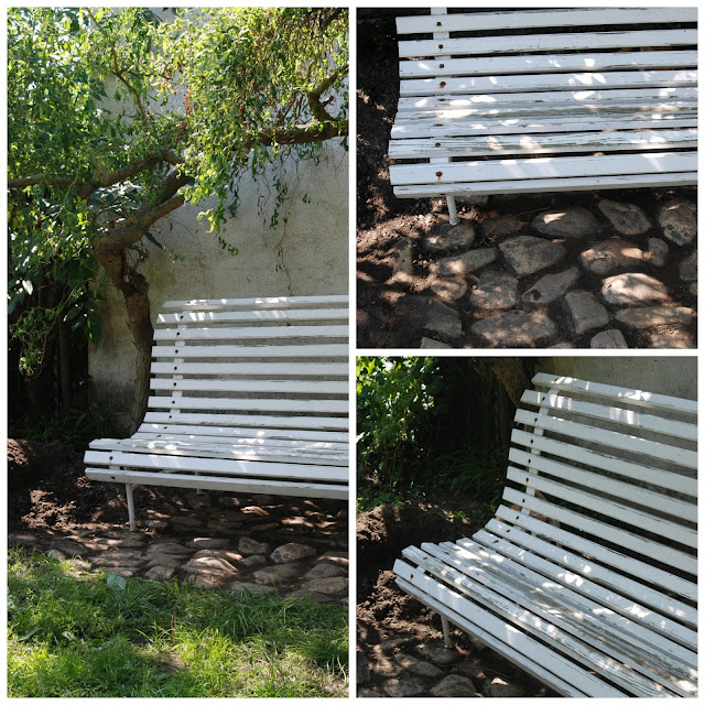 Moje zahradní zásahy se letos krom obstarávání našich deseti rajčat, cukety a dýně omezily na vycídění lavičky a „vydláždění“ země pod lavičkou. Lavičku jsme zdědili s domem a hned první jaro (to znamená před sedmi lety) ji muž obrousil, natřel, doplnil vylámaná prkna a sešrouboval. Lavičky se rekonstrukce příliš nedotkla, stačilo ji pořádně vydrhnout.