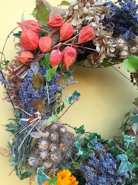 Barevné podzimní věnce s využitím všemožných rostlin, květů čerstvých i sušených…tentokrát tvoří podzimní venkovní výzdobu našeho malého domku.