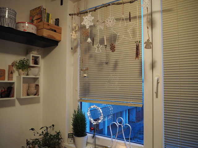 … až mě napadlo tohle. Okno bylo po opravení žaluzií bez závěsu hodně prázdné a tohle řešení je zase na delší dobu. Možná jenom po vánocích sundám andílky a svíčky. Sněhové vločky háčkované a papírové tam ještě nějakou dobu pobudou a něco možná přidám a pak se uvidí …