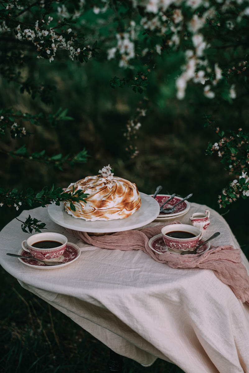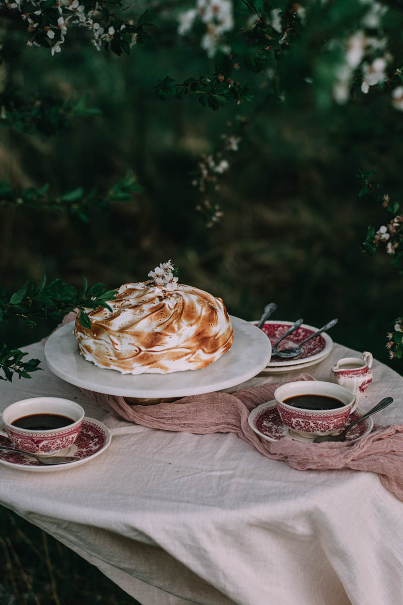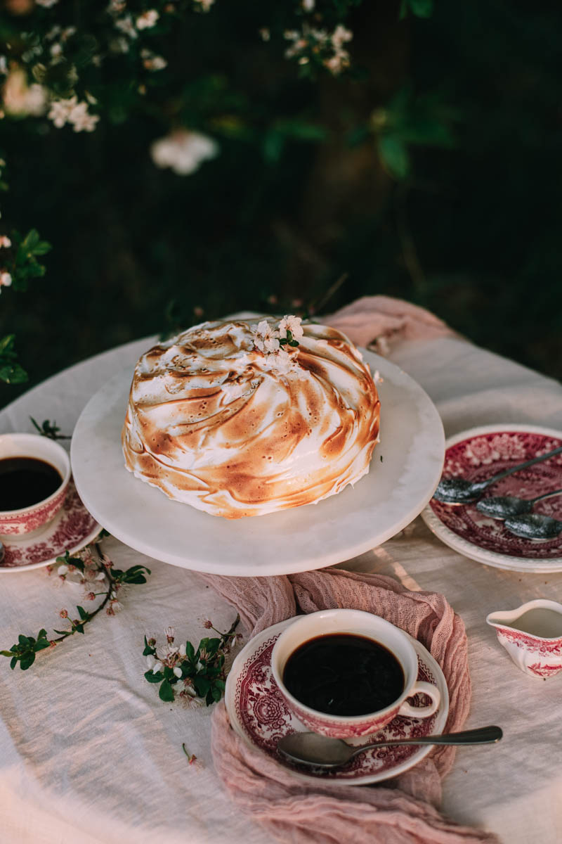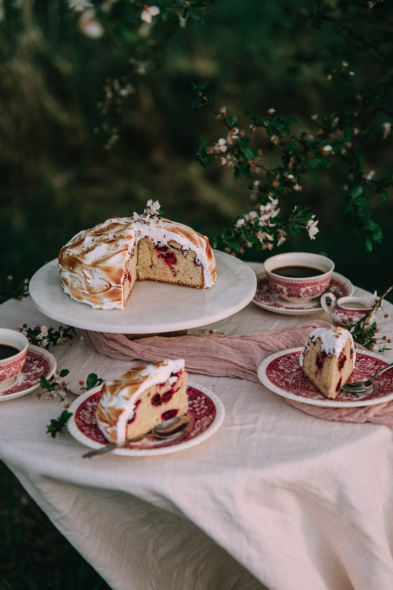Tento koláč vznikl velkou náhodou a snahou spotřebovat suroviny, které mi zbyly. Úplně původně jsem totiž měla v plánu upéct „jen“ bublaninu s višněmi, které ještě zůstaly v mrazáku. Zároveň mi zbyla asi polovina sněhu z indiánků, které jsem připravovala. Tak jsem jej nanesla na bublaninu a oflambovala. A musím říct, že kombinace je to úplně skvělá. Těsto na bublaninu bývá většinou sušší, nicméně toto těsto, které na bublaninu už dlouho používám, je krásně vláčné. Také jsem přidala víc višní, aby byl koláč šťavnatý. Právě nakyslá chuť višní se skvěle doplňuje se sněhovým krémem.