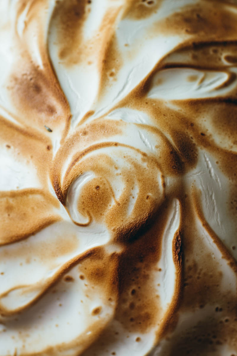 Meringue naneseme špachtlí na vychladnutý koláč. Pomocí flambovací pistolky oflambujeme části sněhu – ale pokud pistoli nemáte, nemusíte, výborný je i bez flambování :-).