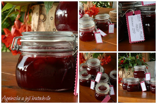 … je naše marmeláda-džem z červeného rybízu, jahod a hrsti malin .-) Jahody jsou kupované, maliny jsou malinoostružiny z vlastní zahrádky a hromadu rybízu přivezla Viktorka jako výslužku z několikadenního pobytu u babičky 🙂