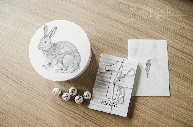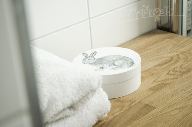 Ke kartičkám jsem dostala ještě ručně vyrobenou krabičku s králíčkem, korálky s ptáčky a osobní handmade přáníčko. Veronika se věnuje zdobení předmětů metodou decoupage a její výrobky jsou jemné, decentní, minimalistické a většinou černobílé, prostě podle mého gusta. Její blog sleduju už delší dobu a rozhodně stojí za shlédnutí. Musím přiznat, že mě docela nahlodala a umanula jsem si, že Madlence zkusím v tomto duchu taky něco vyrobit do pokojíčku (kdy k tomu ovšem dojde, to je zatím ve hvězdách. Já toho mám v hlavě prostě pořád tolik!). Vlastně jsem si původně myslela, že krabička s králíčkem taky skončí u ní. Však to znáte - na takové ty holčičí poklady. Ale když ona je tak krásná a v naší koupelně jí to moc sluší, že si ji asi nakonec sobecky nechám pro sebe (taky na holčičí poklady!). Tady aspoň jedno ilustrační foto.