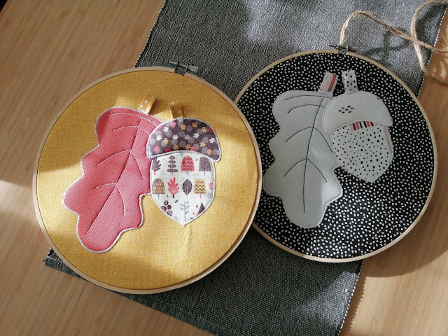 ono to s tím šitým podzimem, o kterém jsem psala v minulém příspěvku začalo vše úplně jinak. Ještě více než girlanda, nebo listy z látky mě zaujaly vyšívací kruhy využité jako věnec nebo obrázek, pověšený buď na dveřích, nebo na zdi (fotila jsem na sedačce, i když tento kruh visí na bytových dveřích. Ty máme děsně nefotogenické a jak se říká pro ostudu - kazilo by to dojem ;-)). Inspirace je opět z Pinterestu ...