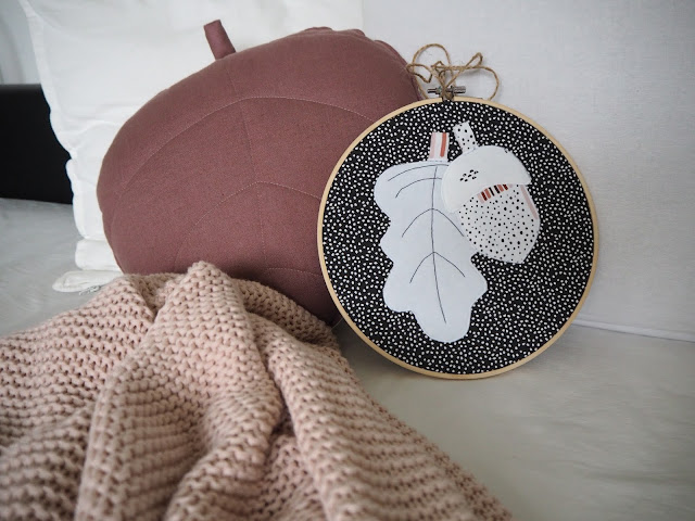 ono to s tím šitým podzimem, o kterém jsem psala v minulém příspěvku začalo vše úplně jinak. Ještě více než girlanda, nebo listy z látky mě zaujaly vyšívací kruhy využité jako věnec nebo obrázek, pověšený buď na dveřích, nebo na zdi (fotila jsem na sedačce, i když tento kruh visí na bytových dveřích. Ty máme děsně nefotogenické a jak se říká pro ostudu - kazilo by to dojem ;-)). Inspirace je opět z Pinterestu ...