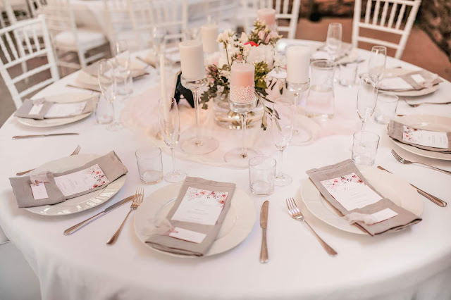 Co ale můžete vytvořit s předstihem je určitě menu. To jsme měli vyřešené již několik měsíců dopředu a tady se žádná změna nekonala. DL formát jsme ozdobily stejným květinovým motivem, postříbřeným fontem a seznamem, co najdou hosté ve studeném rauty i během oběda. I přesto, že jsme měli raut a ne servírovanou hostinu, jsem si chtěla užít hezky prostřené stoly s celým settingem včetně menu. Kromě něj mi Lucka vyrobila i bar menu, kde byl seznam drinků, které si hosté mohli objednat na baru.