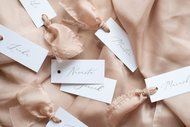 Další jsme tiskly jmenovky, které měly ten stejný font, jako naše oznámení. Lucka je všechny postříbřila, vytvořila cvočky a já sehnala hedvábné stužky, které mi k nim přišly úplně nejhezčí a nejjemnější. Nic přehnaného, prostě v našem stylu. S jmenovka bych ale počkala jako poslední bod, protože nám se hosté a jejich doprovod několikrát měnil, takže jsme je museli dovyrábět.