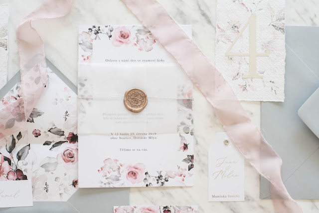 Naše svatba se nesla v pastelových barvách růžové, bílé, světle zelené, šedé s dotekem stříbra, který jsme chtěli mít i na dekoracích. Na Etsy jsem si vyhlídla jeden typ svatebních pozvánek v našich barvách a hledala podobný květinový vzor, který jsem nakonec objevila na Shutterstocku. Společně s talentovanou kamarádkou Luckou, kterou asi znáte pod názvem jejího obchodu Love & Story Design, jsme vytvořily design svatebních pozvánek. Krásný font, který se pak objevoval na všem dalším jsme našly v Creative Marketu. Neskutečná databáze grafiky, ilustrací a fontů, kde můžete strávit věčnost. Květinový vzor v decentních barvách nepravidelně lemuje okraj, naše jména jsou pak postříbřena stříbrnou fólií. Další detaily ohledně dress codu, obuvi atd. jsme vytiskly na druhou kartičku. Mého muže ještě napadlo vytisknout kartičku s QR kódem, který pozvané navedl rovnou na naše FB stránky, kde jsme měli veškeré info. A protože samotné pozvánky je potřeba nějak předat, vymazlily jsme s Luckou i packing. Přes pozvánku přišel navrch pruh poloprůhledného voskovaného papíru, stříbrná šňůrka a pečeť s našimi iniciály. Tu jsem si nechala vyrobit na Aliexpress, když si vyhledáte Seal Stamp, najdete jich mraky, stejně jako variant fontů. Metalický pečetní vosk jsem pak objevila tady. Růžový ani šedivý mi nepřišel dost zajímavý, ale metalický odlesk vypadá skvěle i přesto, že není ve stejném odstínu. Pečetní vosk bych objednávala radši od nás, pokud vám dojde, můžete pak na něj ze zahraničí dlouho čekat. Nebo ho jednoduše přiobjednejte více do zásoby.