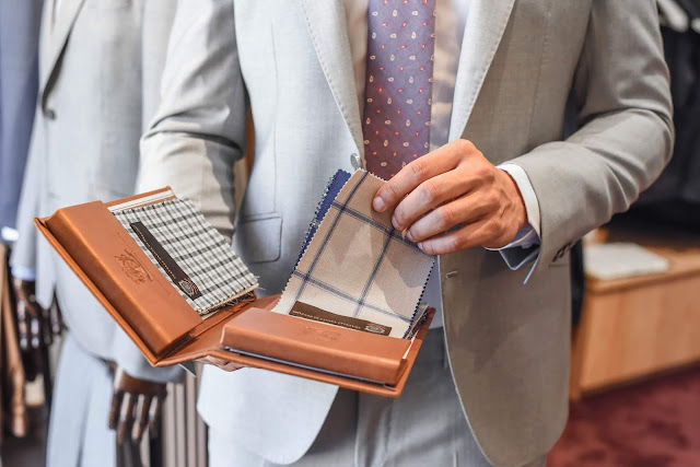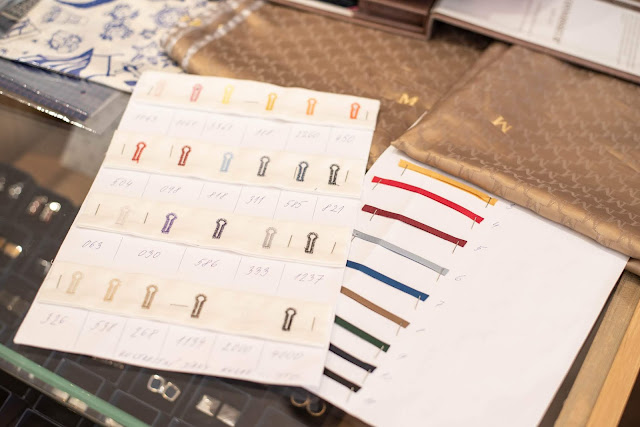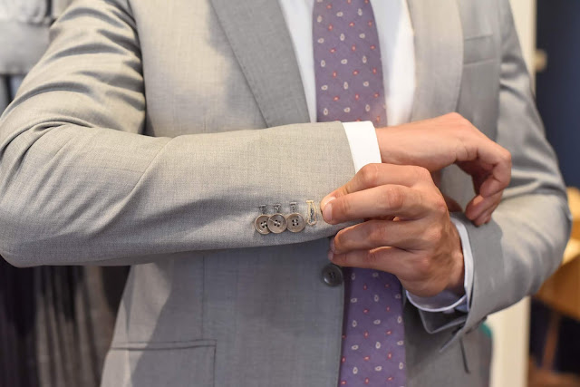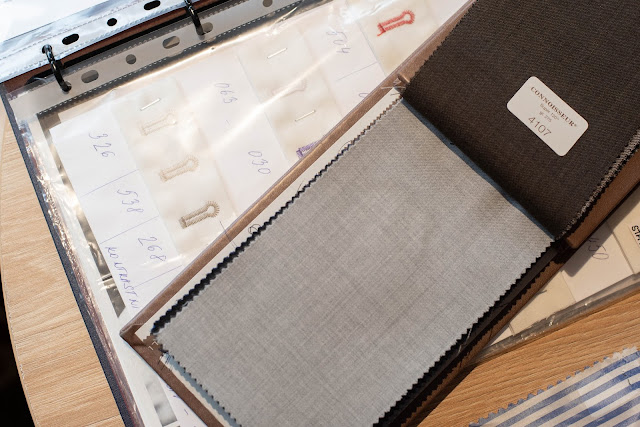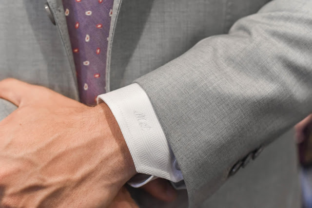 My jsme zvolili metodu made to measure, která nám vyhovovala. Mohli jsme si zvolit vrchní materiál, podšívku, šířku klopy saka, délku fazony, délku rukávu, podle košile a toho, zda bude mít muž hodinky, typ bočních kapes (s klopou nebo pouze výpustkami), kapsu na mobil, typ a barvu knoflíků, vnitřní monogram, barvu vnitřního olemování a štepování. U košile volíte tvar límečku, typ zapínání (otevřené nebo skryté), manžety, knoflíčky a samozřejmě si na ni můžete nechat vyšít monogram. Prostě si můžete vybrat tolik detailů, díky čemu získáte zcela personifikovaný kousek. Bude prostě váš. Všechno najdete přehledně tady.