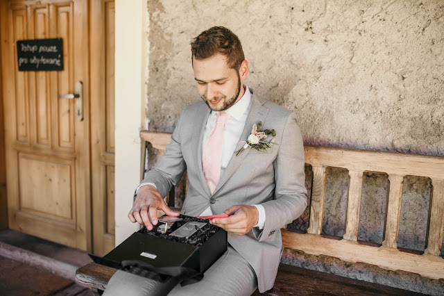 Boty v tmavší šedé jsme nakonec objevili při cestách po Holandsku, stejně jako bílý kožený pásek. Tmavý by tolik nevynikl. A kravatu jsme chtěla sladit do růžových tónů, ale spíše starorůžových, aby měl něco i v mých barvách, protože moje šaty měly pudrově růžovou podšívku a tahle barva se pak objevovala i v květinách a na veškeré grafice. Jednu takovou vhodnou kravatu jsem mu objednala z Etsy, ale nakonec měla oproti fotkám křiklavější odstín a ten se nehodil. Tak jsem zašla do Apedu, kde berou látky z Itálie a našla žakárový pasley vzor, který byl přesně v tom nenápadném růžovém odstínu, který můj muž byl ještě ochotný akceptovat. Kravatu jsem mu spíchla den před svatbou a udělala super službu, co myslíte? Slušelo mu to? Já se na něj nemohla ve svatební den vynadívat a vlastně na každé fotce je z něj fešák. A aby to nebyl oblek jen na jednu příležitost, vytáhli jsme ho teď na svatbu známých a sedí mu pořád skvěle. Prostě je vidět, že to není konfekce.