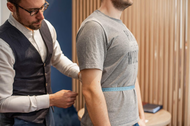 Jsou dvě medoty, podle které si můžete nechat zhotovit kousky na míru. Ta první, méně nákladná a náročná na čas je tzv. made to measure. Tzn. vychází se z konfekční velikosti a podle naměřených rozměrů se k ní cm přidávají nebo ubírají tam, kde je to potřeba. U partnera jsme vycházeli z velikosti saka 48 a přidávali cm hlavně v oblasti hrudníku a boků. Podle všech naměřených údajů pro velikost saka, kalhot a košile se oblečení nechá ušít. Hotové pak přijde na zkoušku a upravují se menší detaily, jako např. délka kalhot, zúžení nebo menší rozšíření nohavic, úprava záševků, posunutí knoflíků apod. U made to measure je tedy jen jedna finální zkouška a případné úpravy navíc.
