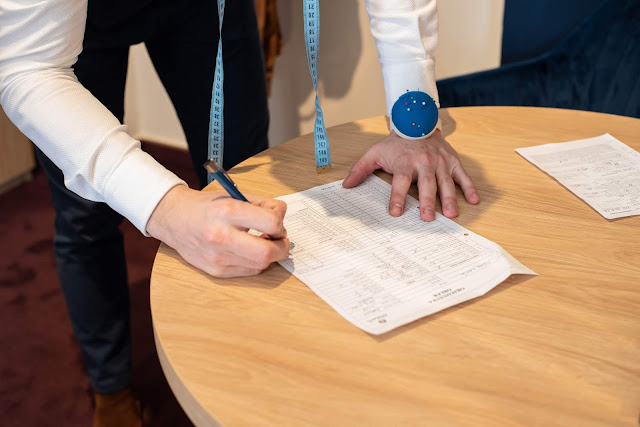 Jako to celé probíhalo. Při první návštěvě jsme vybírali materiál, ověřovala se jeho dostupnost, nakonec jsme na něj museli z Itálie chvíli počkat, ale jelikož jsme oblek řešili s předstihem, byl na to čas. Standardně je oblek ušitý cca do 3 týdnů, ale už kvůli možným úpravám, si dejte trochu větší předstih. Jistota je jistota. Vybrali jsme materiál na oblek, podšívku, bavlnu na košili a všechny detaily. Vyzkoušeli nejvhodnější velikost saka, kalhot i košile, ze kterých se bude při šití vycházet. Pak se šlo na měření všech údajů, jako je délka kalhot, rukávů, zad, obvod hrudníku, krku, zápěstí, pasu, boků, šířka ramen, atd. Všechno se pečlivě zapíše do tabulky a ta se s objednávkou zasílá do výroby.