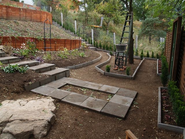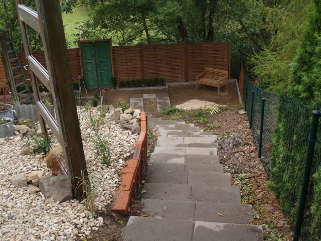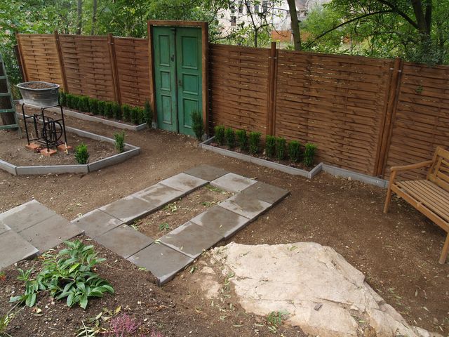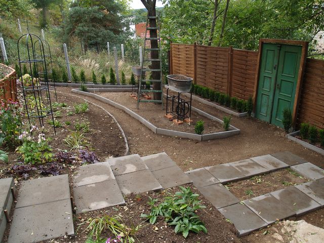 V úplně spodní části jsou zakopané obrubníky nachystané na vysypání cest, štěrkem. U plotu jsou falešné dveře, kde budou nalepená zrcadla, u dveří jsou zasazené sloupové tisy. Podél spodního plotu mám oblíbené buxusy, dlužichy a obrovskou hromadu okrasných fialových česneků.